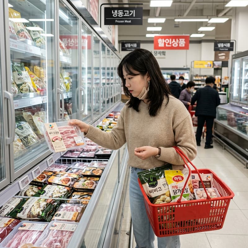 냉동실을 아군으로: 대패삼겹살, 닭가슴살, 냉동 만두 같은 고단백 냉동 식품은 유통기한 압박 없이 단백질을 보충해 줍니다.