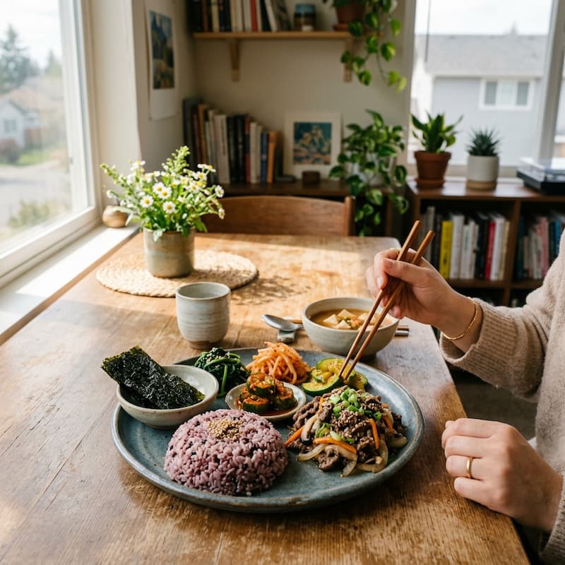 나를 위한 대접: 비록 자취방에서 혼자 먹는 밥이지만, 예쁜 접시에 담아 천천히 즐겨보세요. 그 마음이 배달 음식을 시키고 싶은 공허함을 채워줍니다.