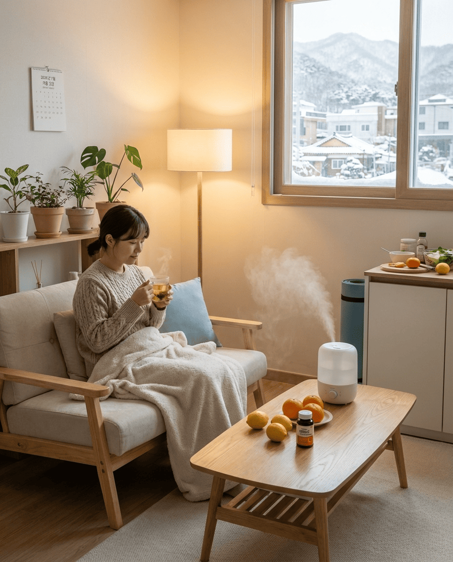 겨울에는 실내 활동이 늘어나고 환기 횟수가 줄어듭니다. 건조한 공기는 호흡기 점막을 약하게 만들어 바이러스에 취약한 환경을 만듭니다. 또한 일조량 감소로 인해 비타민D 합성이 줄어들면서 면역력과 기분 상태에도 영향을 줍니다.