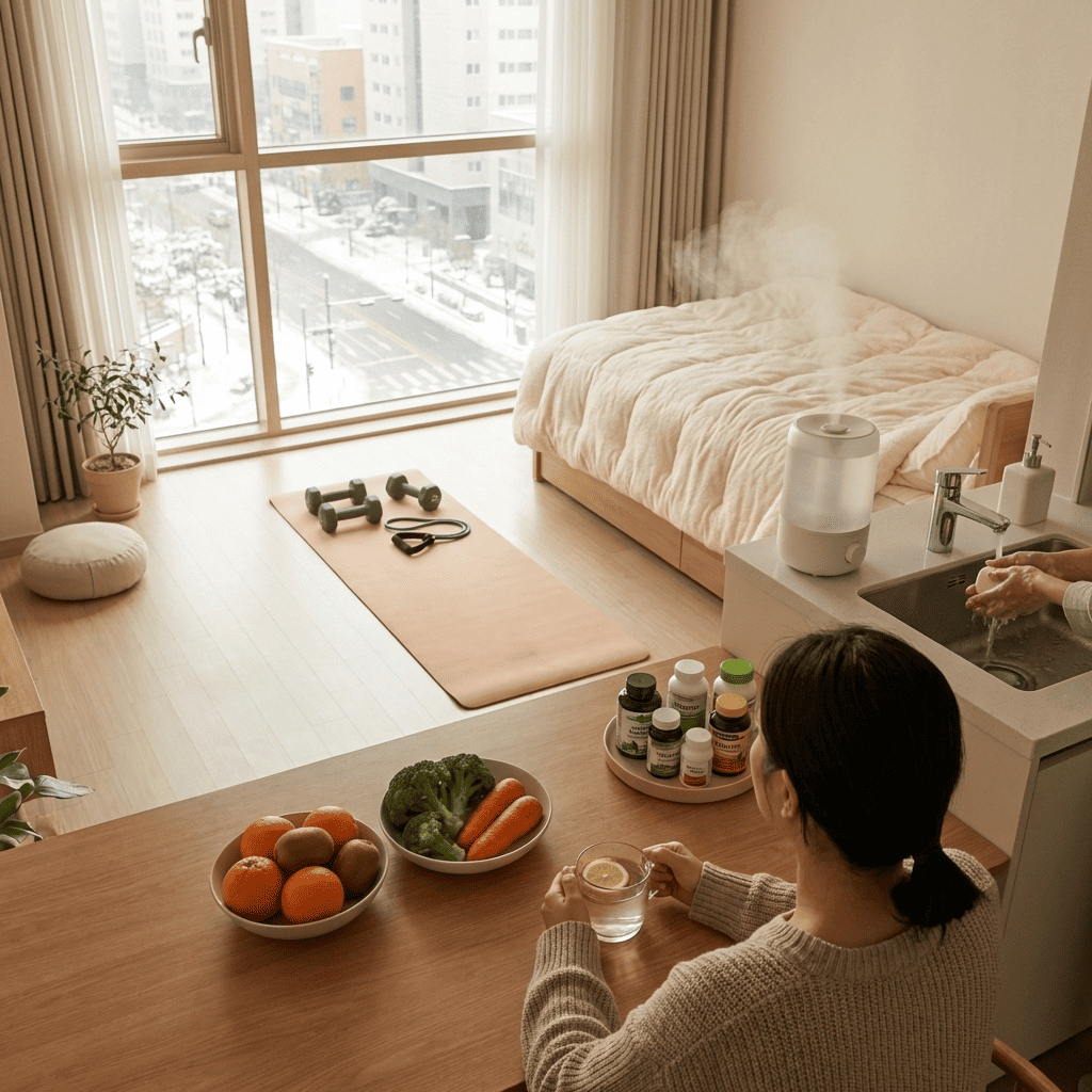 겨울철 건조한 공기는 호흡기 점막을 약하게 만들어 바이러스 침투를 쉽게 합니다. 가습기 사용, 젖은 수건 걸어두기 등으로 적정 습도를 유지하면 호흡기 보호에 도움이 됩니다.